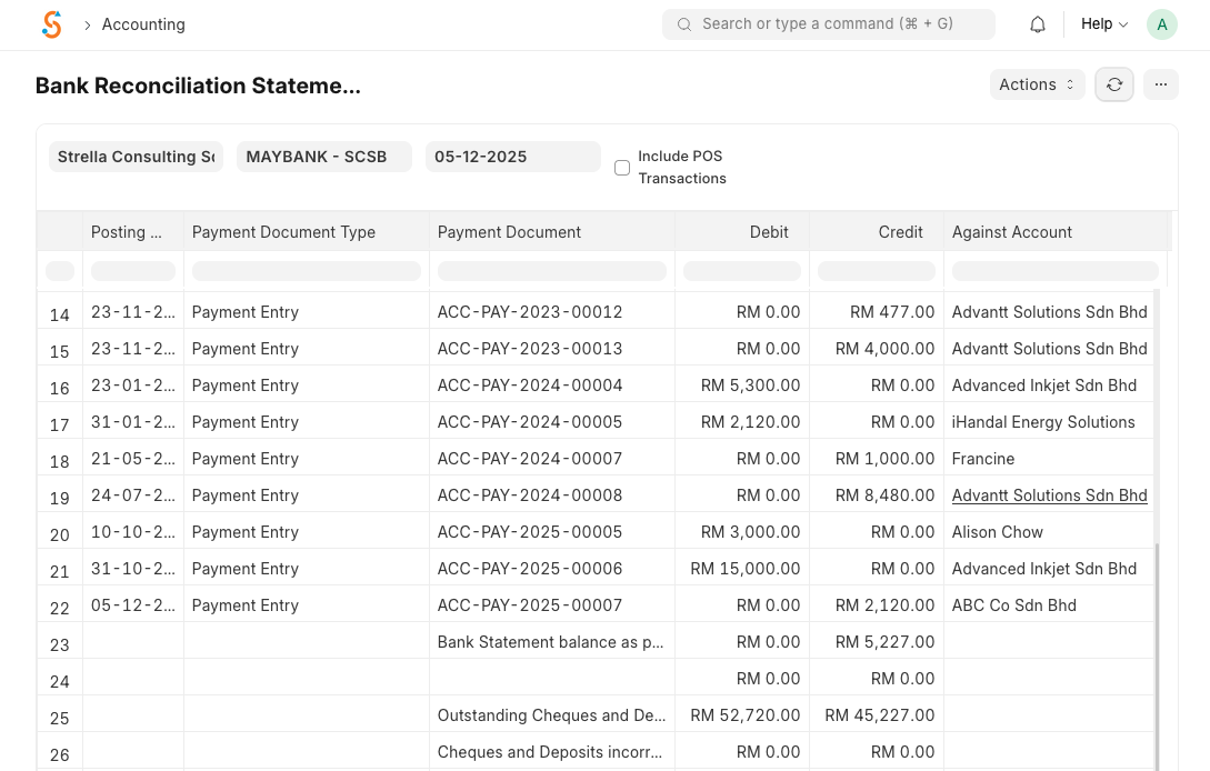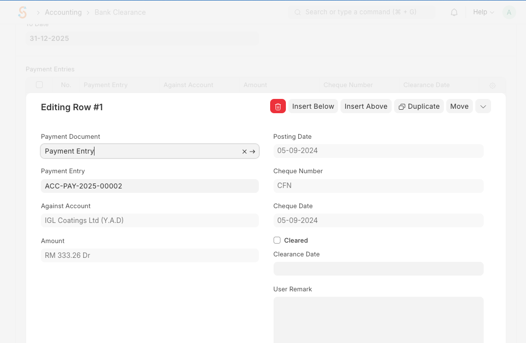 - Once all applicable entries have clearance dates, verify that the Balance as per bank matches your statement. Any mismatch indicates missing or incorrectly dated entries, which should be reviewed.