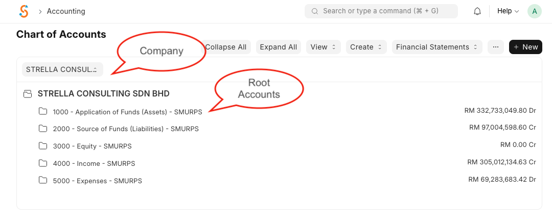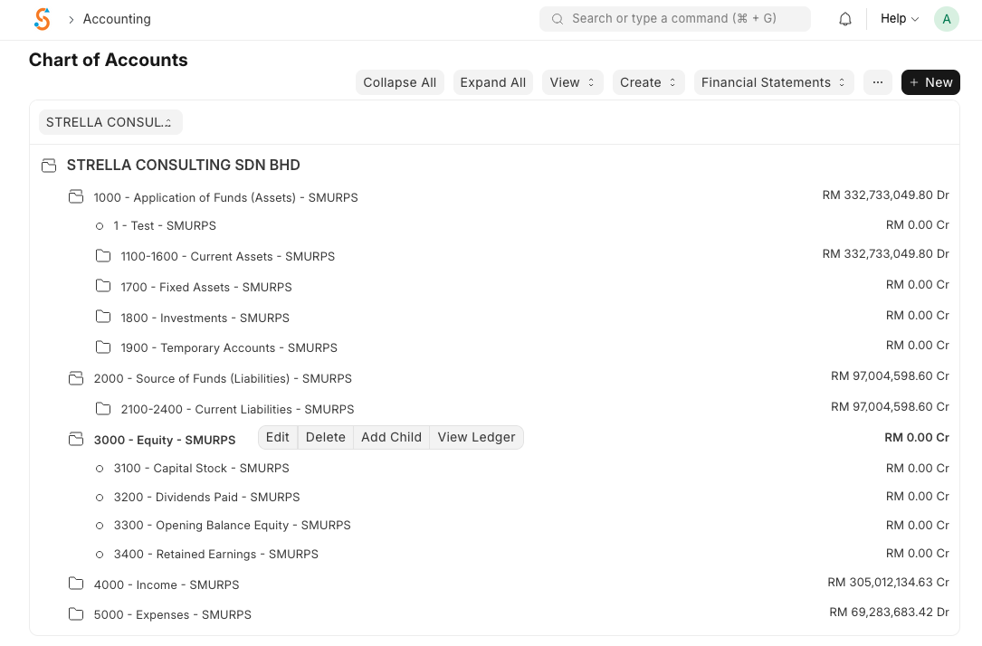The Chart of Accounts (CoA) in SMURPS is a tree‑based structure that lists all the accounts and ledgers for your company. It reflects the fundamental double‑entry accounting principle—every financial transaction must debit one account and credit another. Top‑level groups such as Assets, Liabilities, Equity, Income, and Expenses organise the accounts into balance sheet and profit & loss categories.