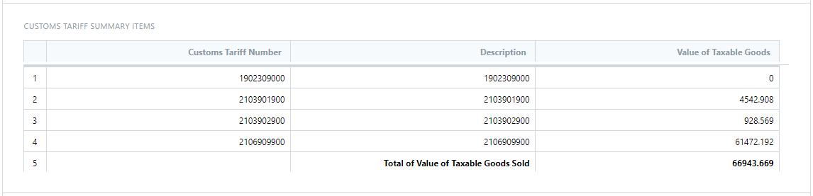 Summarized information of the taxable Sales Invoice transactions by the Item Customs Tariff Number.