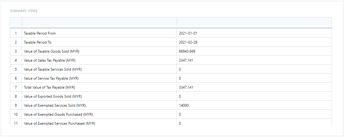 Summarized information of the taxable Sales Invoice transactions based on the Sales and Service Tax Configuration setup.